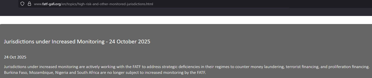 heading somewhat off-topic but South Africa, Burkina Faso, Mozambique, and Nigeria are no longer on the grey list.