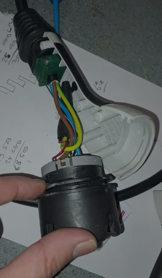 The “granny cable” EVSE’s plug was broken. I noticed this on Friday. Not so badly that it was unuseable, but the front was no longer attached properly to the handle. I glued it back together with Q-bond. In this picture my index finger is on the ring that had broken off: