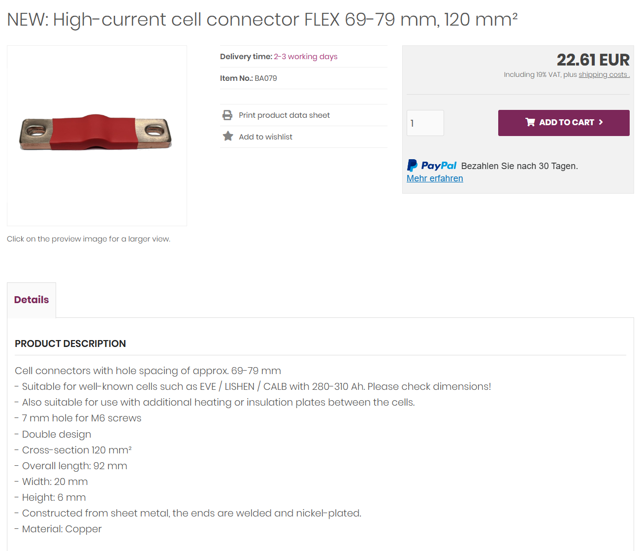 Think of it like this, pay $60 USD for an LF304 (ex China) and pay 45 EUR for two cell interconnects. Doesn’t make sense. The other way to look at it is, look how cheap LFP cells have become.