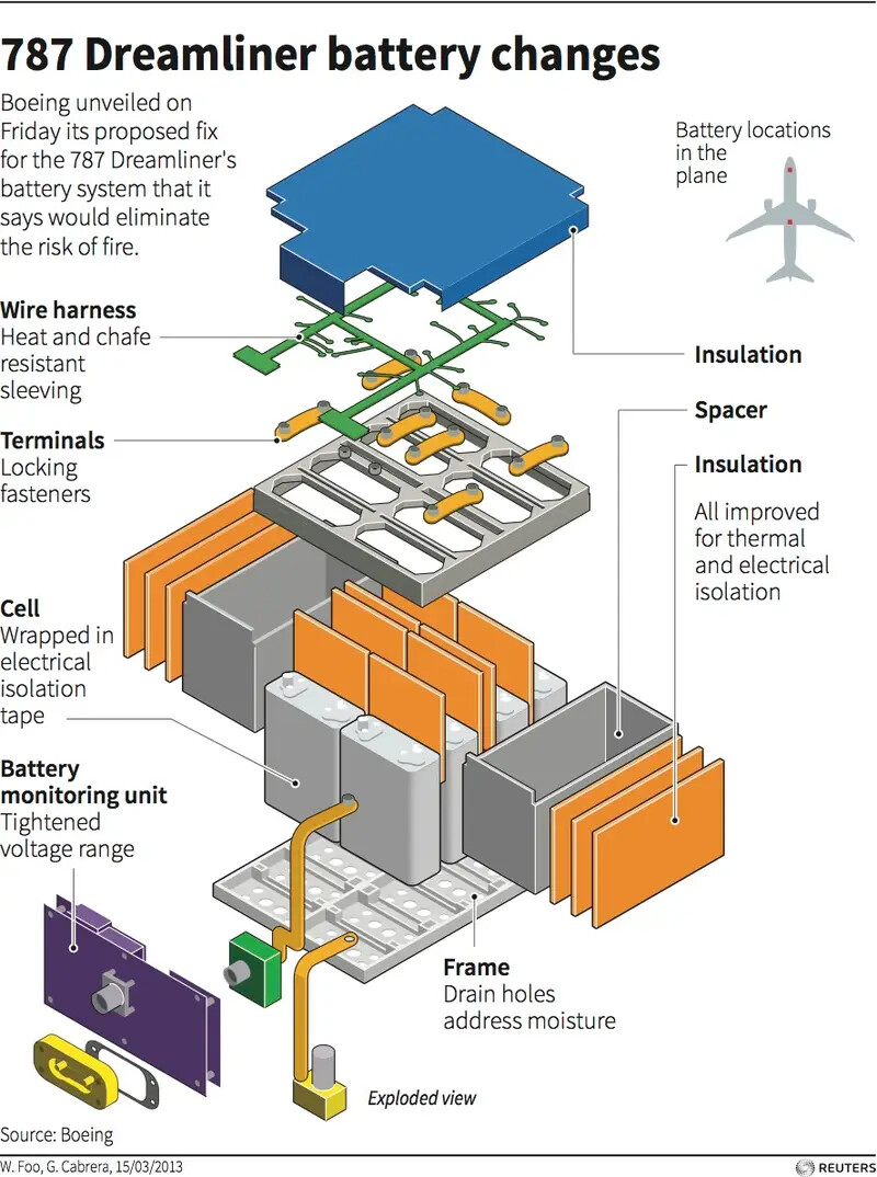 Of course the entire thing is nonsense, the lithium battery is literally used only when black-starting the plane, or for running lights while being pulled by a tow truck, and it powers only the captainās side. The entire electrical system is specifically designed to have everything redundant (two alternators in each turbine, two power conversion units, everything redundant, plus two switches so you CAN bridge the 24V between captain and first officer manually in an emergency⦠although that is not what happened in this case. I digress. Anyway⦠so that is when I heard that there was an incident with a burning battery in a 787, and now the thing sits in a stainless steel box vented to the outside of the plane, and they have space between the cells to prevent thermal runaway from spreading to adjacent cells.